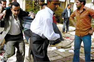 日益嚴(yán)重的暴力沖突導(dǎo)致眾多伊拉克教師和學(xué)生被殺。圖為巴格達(dá)的一所大學(xué)里,救援人員抬著一名在自殺襲擊中受傷的學(xué)生。