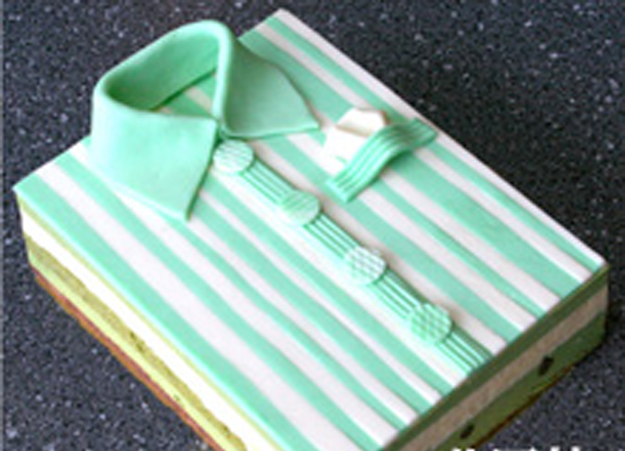 “襯衣蛋糕”表面色彩為綠色和乳白色的條紋,還配有綠色的領子和4個巧妙的襯衣紐扣,遠遠看起來就像一件折疊整齊的襯衣。