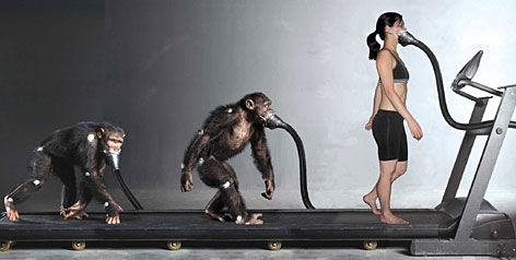 四名人類志愿者以及五只黑猩猩作為研究對象。通過測量他們在跑步機上行進過程中消耗的氧氣和運用的力量,計算他們各自所耗費的能量。結果發現人靠兩足行走的步法比黑猩猩四肢行走的步法要節省75%的能量。