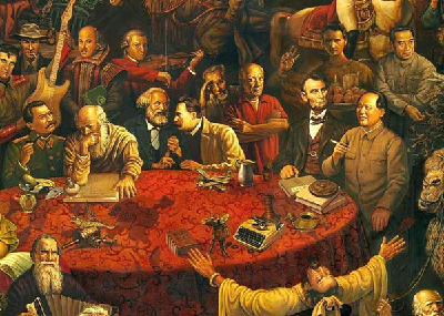在103位名人中,中國領袖毛澤東坐在油畫正中間的圓桌邊抽煙,旁邊的美國前總統(tǒng)林肯似乎正在聆聽毛主席的話語,而毛主席身后站著的是周恩來總理。油畫中馬克思和列寧正進行深入地交流;“一代天驕”成吉思汗與拿破侖并駕齊驅;美國前總統(tǒng)布什手持望遠鏡,而恐怖大亨本·拉登則悄然站在他身后;東條英機跪在秦始皇面前,仿佛是在懺悔。此外,中國古代唐代大詩人李白則靠在一把椅子上作仰天長嘆狀,他的面前擺著一只酒樽和一部現(xiàn)代的打字機。