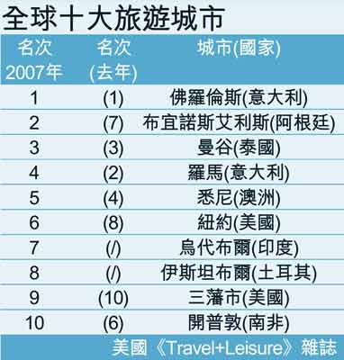 中國日報網環球在線消息:美國《Travel+Leisure》旅游雜志昨天公布“2007年全球十大最佳城市”及“全球百大最佳酒店”排行榜,意大利佛羅倫斯今年蟬聯最佳旅游城市首位,香港及北京仍受各地旅客愛戴,兩地分列亞洲區最佳旅游城市的第7位及第10位。