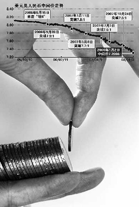 來自中國外匯交易中心的最新數據顯示,2007年,在多重升值壓力的共同推動下,人民幣對美元月平均匯率呈現單邊走高趨勢,其中11月月平均匯率為7.4233,較前月大幅走高779個基點,為全年月平均匯率升幅最高紀錄;12月月平均匯率則報7.3676,較前月上升557個基點。