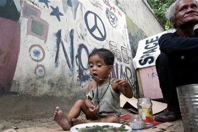 | 無家可歸的菲律賓幼童在路邊吃午餐 |