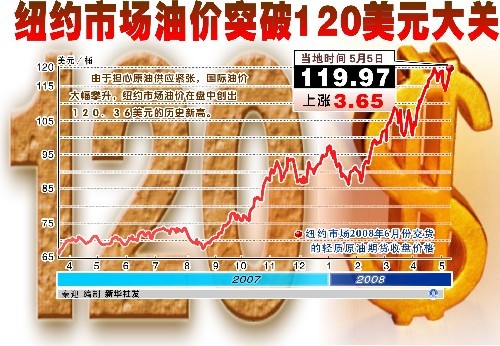 中國(guó)日?qǐng)?bào)網(wǎng)環(huán)球在線消息:美國(guó)東部時(shí)間周一,在美元指數(shù)回調(diào)以及市場(chǎng)投資者對(duì)供應(yīng)憂慮的推動(dòng)下,國(guó)際油價(jià)繼續(xù)了上周五的大漲走勢(shì)。國(guó)際油價(jià)標(biāo)桿——紐約期貨交易所(NYMEX)6月原油期貨當(dāng)日上漲超過(guò)3美元,盤(pán)中首次突破120美元大關(guān),創(chuàng)下了120.36美元/桶的歷史新高。近兩個(gè)交易日國(guó)際油價(jià)已上漲超過(guò)7.5美元,漲幅高達(dá)6.6%。