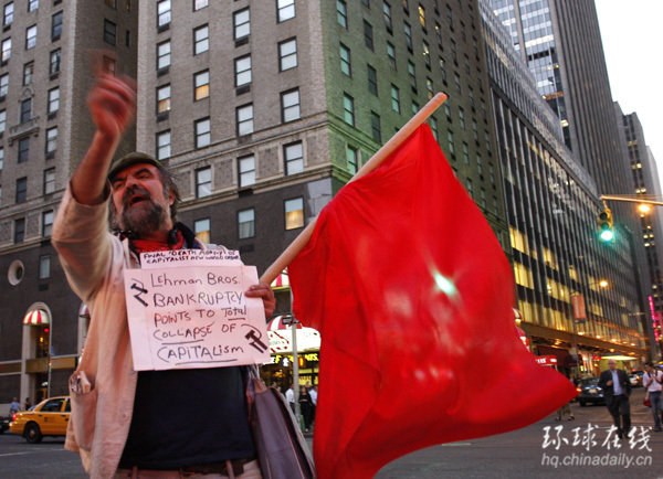一位手舉紅旗和標語的示威者在雷曼兄弟銀行門外