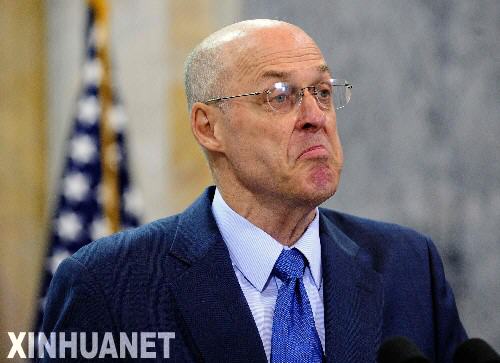 10月14日,美國財長保爾森在華盛頓舉行的聲明會上發言。當日,保爾森和美聯儲主席伯南克及總統金融工作市場小組的成員在位于華盛頓的美國財政部發表聲明,公布新救市方案的詳情。新華社記者張巖攝