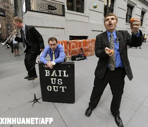 華爾街街頭,幾名失業者玩起了雜耍,希望由此引起人們對在這次金融風暴中的失業者的關注。自今年年初以來,美國新增失業人數略高于75萬人,增長速度從今年前8個月的平均每月7.5萬人增至9月份的15.9萬人。華爾街更慘,五大投行無一幸存。大量裁員已是必然。紐約市政府估計,華爾街困境將使紐約喪失4萬個高薪崗位,未來兩年損失300億美元稅收收入。
