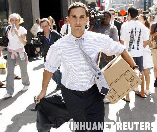資料圖片:9月15日,在美國紐約,一名雷曼兄弟公司的雇員拿著裝有私人物品的紙箱離開公司。當日,美國第四大證券公司雷曼兄弟申請破產保護,意味著這家在華爾街生存了158年的老牌投資銀行將壽終正寢。新華社/路透