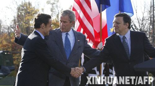 10月18日,在美國馬里蘭州戴維營,美國總統(tǒng)布什(中)歡迎到訪的法國總統(tǒng)薩科齊(左)和歐盟委員會主席巴羅佐。布什當(dāng)天宣布,美國將于近期就國際金融危機(jī)問題主持召開一次國際峰會。新華社/法新