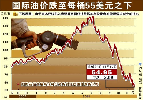 圖表:國(guó)際油價(jià)跌至每桶55美元之下 新華社發(fā)