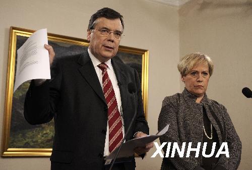 11月17日,冰島總理哈爾德(左)與外交部長吉斯拉多蒂爾在首都雷克雅未克召開新聞發布會。冰島政府16日宣布,它已與歐盟一些成員國就解決儲戶存款被凍結的糾紛達成指導原則,從而為冰島獲得國際援助應對金融危機清除一大障礙。新華社記者郭磊攝