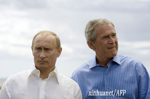 7月2日,美國總統布什(右)在美國緬因州肯納邦克波特其父老布什的莊園同俄羅斯總統普京會晤。雙方就兩國關系、建立導彈防御系統和伊朗核計劃等共同關心的問題交換了意見。