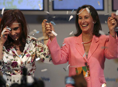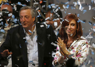 中國日報網環球在線消息:在10月28日的阿根廷總統大選中,第一夫人克里斯蒂娜·費爾南德斯順利勝出,將成為該國歷史上第一位民選女總統,而她和丈夫、阿根廷現任總統基什內爾輪流成為一國民選總統的結果也創造了歷史。