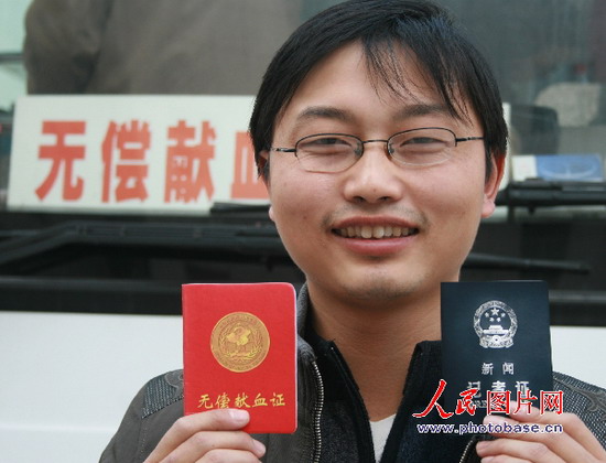 11月7日,安徽安慶日報社一名記者展示獻血證和記者證。