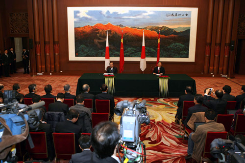 12月28日,國務院總理溫家寶與日本首相福田康夫在北京人民大會堂共同會見記者。新華社記者高潔攝