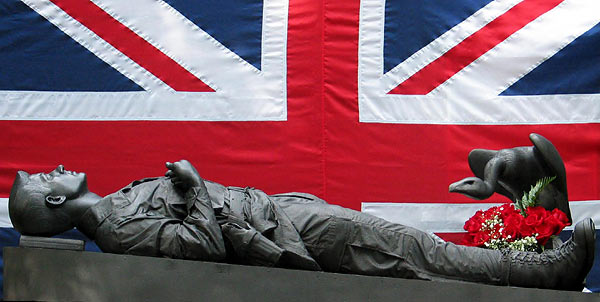 剛剛23歲的英國哈里王子血氣方剛,風華正茂,一直嚷嚷著要去伊拉克戰場表現表現,但英國政府為了他的安全大計,偏偏不給他這個機會。不過,這并不妨礙有好事者急不可待地為他塑造了一尊在伊拉克陣亡的“死亡雕像”:只見哈里王子一動不動地躺在英國國旗前,兩只耳朵被割掉,雙眼上安放著硬幣,腳上有一只禿鷹,虎視眈眈,昂首欲撲,仿佛正準備把哈里王子的“尸體”當作一頓可口的大餐。(王輝)