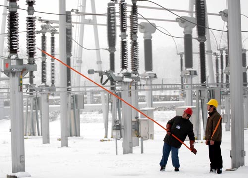 月29日,安徽省淮北供電公司員工用絕緣棒清理電力設備上的覆冰和積雪。 連日來,針對覆冰、積雪和濃霧對電網的不利影響,安徽省淮北供電公司組織員工對所管轄的變電站、輸電線路進行特巡,提高巡視頻率,并隨時觀測輸電線路溫度變化,及時排除隱患,確保電網安全穩定運行。