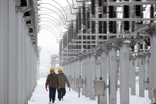 1月29日,安徽省淮北供電公司員工在變電站巡視。 連日來,針對覆冰、積雪和濃霧對電網的不利影響,安徽省淮北供電公司組織員工對所管轄的變電站、輸電線路進行特巡,提高巡視頻率,并隨時觀測輸電線路溫度變化,及時排除隱患,確保電網安全穩定運行。