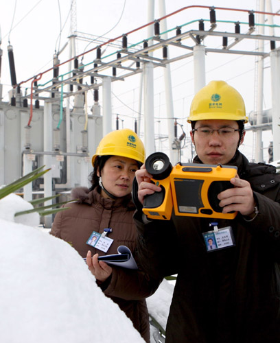 1月29日,安徽省淮北供電公司員工在用紅外測溫儀測量溫度變化。 連日來,針對覆冰、積雪和濃霧對電網的不利影響,安徽省淮北供電公司組織員工對所管轄的變電站、輸電線路進行特巡,提高巡視頻率,并隨時觀測輸電線路溫度變化,及時排除隱患,確保電網安全穩定運行。