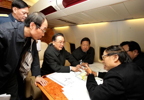 1月28日20時30分,中共中央政治局常委、國務院總理溫家寶從北京趕赴湖南,考察抗冰救災工作。這是溫家寶總理1月28日夜在專機上與國務院有關部門負責人研究抗冰救災工作。