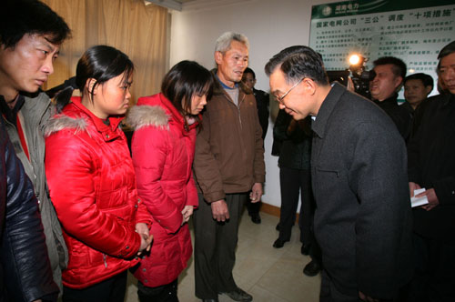 1月29日,中共中央政治局常委、國務院總理溫家寶在湖南長沙看望在沙坪變電站除冰搶險中不幸殉職的周景華、羅長明、羅海文3名電力職工的家屬。溫家寶總理說:“今天面對你們,我無法用更多的語言來表示安慰,我給你們鞠個躬吧!”
