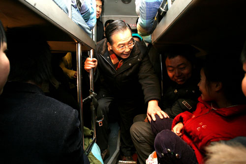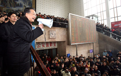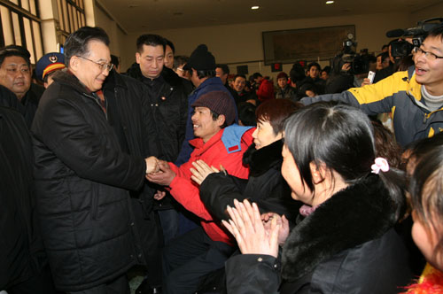 1月29日,中共中央政治局常委、國務院總理溫家寶在湖南長沙火車站看望滯留車站的旅客。溫家寶總理對旅客說,春節快到了,我給大家拜個早年。你們被困在火車站,還沒能提早回家,我表示深深的歉意,現在我們正在想盡一切辦法搶修,一定把大家送回家過春節。