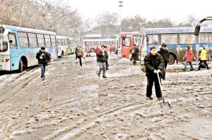 昨日,記者在宿州街頭看到,由于路面積雪融化,許多賣年貨的小攤出現在街頭。一名正在搶購年貨的陳阿姨說,“聽說過兩天還有暴風雪,只能趁這個機會將年貨買齊,等暴風雪來到的時候就不用出門了”。