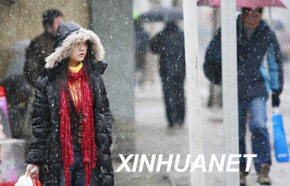 資料圖片2月1日,一位行人冒雪在徐家匯街頭候車。當日13時36分,上海中心氣象臺發布暴雪黃色預警信號,預計兩日內全市累積降雪量將達6毫米。新華社記者裴鑫 攝