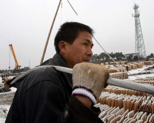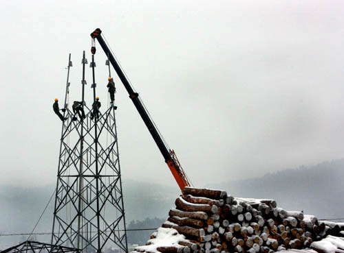 1月中旬以來,50年一遇的罕見冰雪凝凍天氣使貴州電網4146條線路受到破壞,占線路總數的63%,波及到全省44個縣市。目前,貴州電網公司1.7萬干部職工緊急投入抗冰保電工作中,確保人民群眾生活用電。這是電力工人在玉屏縣老山口110千伏受災輸電線搶修現場緊急搶修(1月31日攝)。
