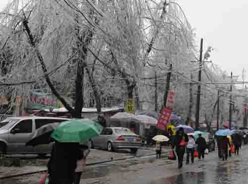 郴州市街道的樹木被冰掛壓彎,電線也被厚冰裹住(2月1日攝)。自1月13日開始,湖南省郴州市遭受50年來最嚴重的冰雪災害,持續的雨雪冰凍導致城區大面積停水斷電,交通不暢,市民生活極為不便。目前,當地政府正在全力保障電力、交通、通訊的恢復和暢通。