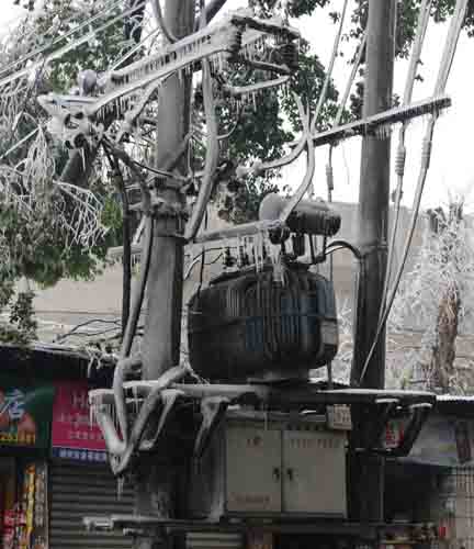 郴州市街道的變壓器上掛滿了冰雪(2月1日攝)。自1月13日開始,湖南省郴州市遭受50年來最嚴重的冰雪災害,持續的雨雪冰凍導致城區大面積停水斷電,交通不暢,市民生活極為不便。目前,當地政府正在全力保障電力、交通、通訊的恢復和暢通。