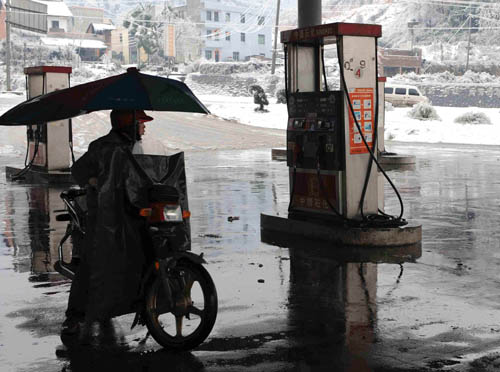在郴州市蘇仙區白路洞鎮的一個加油站,一名騎摩托車的行人在因停電不能工作的加油器前駐足(2月1日攝)。自1月13日開始,湖南省郴州市遭受50年來最嚴重的冰雪災害,持續的雨雪冰凍導致城區大面積停水斷電,交通不暢,市民生活極為不便。目前,當地政府正在全力保障電力、交通、通訊的恢復和暢通。