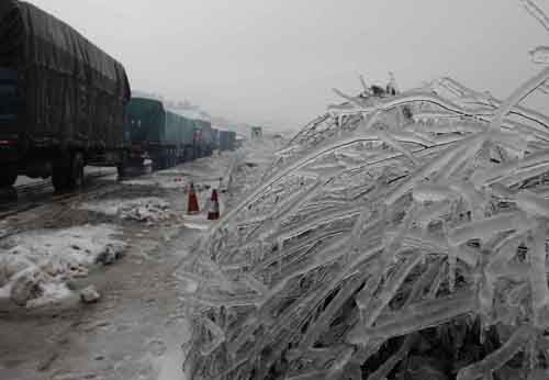 大貨車在京珠高速公路郴州段排隊等候通行(2月1日攝)。自1月13日開始,湖南省郴州市遭受50年來最嚴重的冰雪災害,持續的雨雪冰凍導致城區大面積停水斷電,交通不暢,市民生活極為不便。目前,當地政府正在全力保障電力、交通、通訊的恢復和暢通。