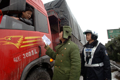 2月1日,湖南省委常委、常務(wù)副省長,省抗冰救災(zāi)指揮部總指揮于來山(中)在京珠高速公路上為司機發(fā)放行路指南。他在高速公路上已經(jīng)連續(xù)工作了7天7夜。面對冰雪災(zāi)害,湖南省的黨員干部發(fā)揮先鋒模范帶頭作用,經(jīng)受寒風(fēng)冰凍考驗,積極奮戰(zhàn)在抗擊冰雪第一線。