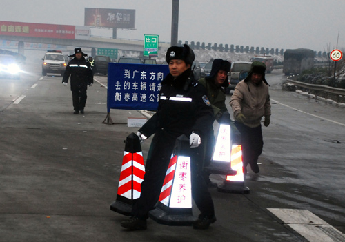 2月1日,湖南省交警總隊副總隊長、高速公路管理支隊支隊長楊能(前)在疏導(dǎo)車輛分流。他在高速公路上已經(jīng)連續(xù)工作了19天。面對冰雪災(zāi)害,湖南省的黨員干部發(fā)揮先鋒模范帶頭作用,經(jīng)受寒風(fēng)冰凍考驗,積極奮戰(zhàn)在抗擊冰雪第一線。
