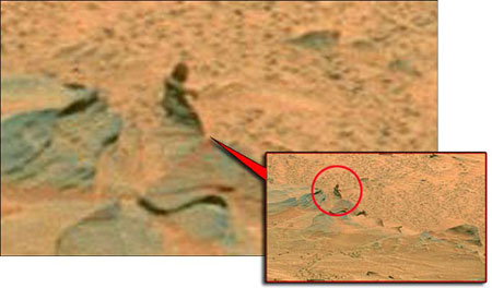 至于今年1月“勇氣”號拍攝到的人形圖片,經過NASA天文學家的鑒定,認為這不過是火星上的巖石而已,而我們之所以會把它看成“火星人”,只是心理學上的“空想性錯視”在起作用,就像我們有時會把天上的白云看成各種各樣的人物和事物一樣。從這張照片上,一個外形類似女性的“火星人”坐在巖石上,手臂伸展,似乎在等待什么。(康娟)