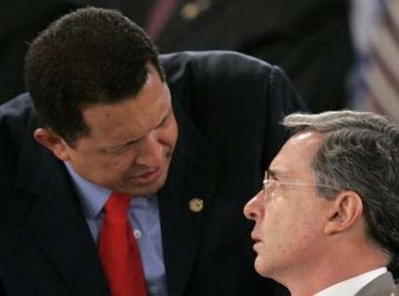 委內(nèi)瑞拉總統(tǒng)查韋斯(左)與哥倫比亞總統(tǒng)烏里韋交談
