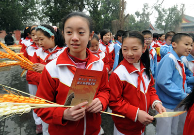 北京市宣武區400余名中小學生在民俗專家的帶領下,在先農壇里齊誦祭文、行祭農禮、識五谷、種五谷,學習傳統的古代祭農禮儀,并按傳統習俗放飛風箏,放飛美好心愿。