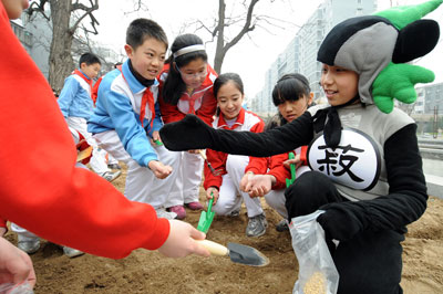青少年們肅立于壇臺上,齊聲恭讀祭文,用稚嫩的聲音朗誦著:“炎黃子孫、自強不息!”隨后孩子們在園林專家的指導下識別農業器械,嘗試播種五谷。5個福娃裝扮的學生領隊,各帶一個小分隊,種植一種谷類。