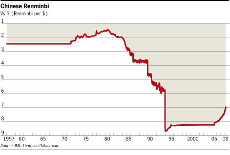 2005年7月21日,中國宣布人民幣匯率不再盯住單一美元,而是實行參考一籃子貨幣的浮動匯率制度。在此前10年間,人民幣對美元匯率一直保持在8.28左右。
