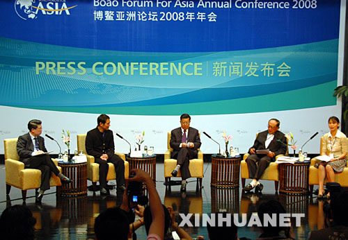 4月11日,博鰲亞洲論壇秘書長龍永圖(左三)、博鰲亞洲論壇理事長拉莫斯(左四)和中國紅十字會博愛大使、本屆年會特殊嘉賓李連杰(左二)出席新聞發布會。當日,博鰲亞洲論壇2008年年會舉行新聞發布會。博鰲亞洲論壇2008年年會各項籌備工作已經就緒,超過1700名來自亞洲和世界其他地區的政府官員、企業代表、專家學者、媒體記者等將參加本次年會。新華社記者 魚瀾 攝