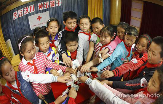 2008年5月13日上午,江蘇省無錫市揚名中心小學大隊部組織全校師生開展“關注汶川,伸出援手”主題活動。本次活動由學校大隊委倡議并發起,通過紅領巾電視臺,全校師生了解了四川汶川的地震災情,大家積極行動伸出了援助之手。在短短的時間內,籌集了1125.8元,學校又從“手拉手”基金中撥出2000元專款,共計愛心款3125.8元,送往無錫市紅十字會,并通過紅十字會向災區的小伙伴轉達全校師生的問候與愛心。攝影:張浩