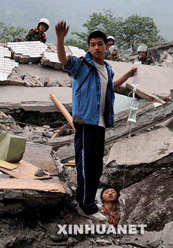 5月13日,在四川省北川縣地震災區,一名北川中學學生在武警官兵幫助下救助被壓在瓦礫堆中的同學。四川汶川地震發生后,北川縣北川中學六至七層高的主教學樓塌陷,當時正值上課時間,21個教室里師生約1000人,除個別逃生以外,大部分被掩埋在瓦礫堆中。目前,大批武警官兵以及當地群眾正在加緊救援。新華社記者陳燮攝