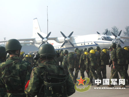 5月13日晨,空軍空降兵某部4500余名官兵在開(kāi)封某機(jī)場(chǎng)登機(jī),奔赴汶川地震重災(zāi)區(qū)參加搶險(xiǎn)救援工作。 新華社記者 李剛攝