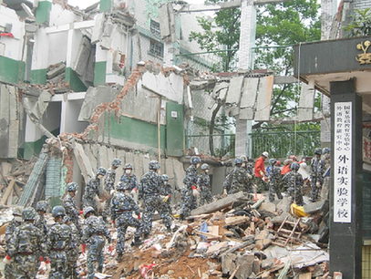 救援人員在東汽中學到倒塌后的廢墟中挖掘生還者
