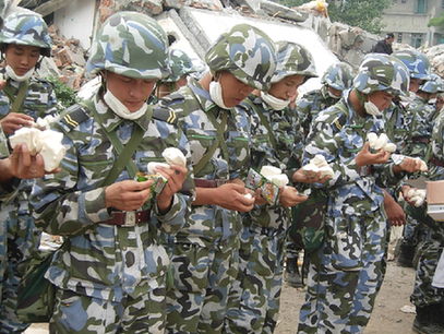 中國人民解放軍雅安預團天全炮兵營有75名士兵在13上午趕到了東汽中學旁邊的東汽技校救援現(xiàn)場。戰(zhàn)士們吃的是饅頭、榨菜、方便面、餅干、薩其瑪?shù)?,吃飯前還要在一個裝滿消毒液的桶里浸泡至少30秒,晚上他們最多能睡6個小時,或者在車上,或者干脆露天。