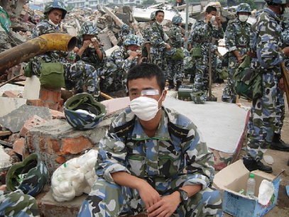記者觀察到,漢旺鎮(zhèn)的救援隊伍來自全國各地,包括從廣東鎮(zhèn)江趕到的中國海軍陸戰(zhàn)隊、來自樂山、上海的消防隊和來自唐山的專業(yè)地震救援隊伍。一名不愿意透露姓名的27歲海軍陸戰(zhàn)隊戰(zhàn)士在當天的生命救援行動中被石頭砸中頭盔,眼睛受傷,縫了3針。他們的指導員也在救援中受傷,但仍堅持在現(xiàn)場指揮工作。