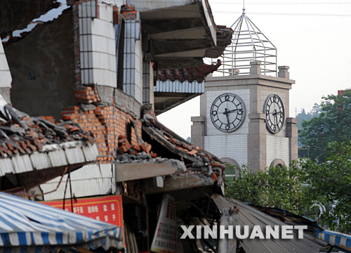 在四川省綿竹市漢旺鎮(zhèn)拍攝的鐘樓,鐘表指針定格在14時(shí)28分(5月18日攝)。國(guó)務(wù)院發(fā)布公告,決定5月19日至21日為全國(guó)哀悼日。5月19日14時(shí)28分起,全國(guó)人民默哀3分鐘,屆時(shí)汽車、火車、艦船鳴笛,防空警報(bào)鳴響。新華社發(fā)