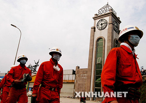 在四川省綿竹市漢旺鎮(zhèn)拍攝的鐘樓,鐘表指針定格在14時(shí)28分(5月19日攝)。國(guó)務(wù)院發(fā)布公告,決定5月19日至21日為全國(guó)哀悼日。5月19日14時(shí)28分起,全國(guó)人民默哀3分鐘,屆時(shí)汽車、火車、艦船鳴笛,防空警報(bào)鳴響。新華社發(fā)