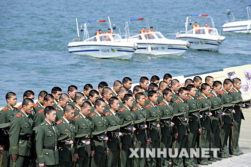 5月19日14時28分,擔(dān)負(fù)奧運會帆船比賽海上安保任務(wù)的青島公安邊防支隊官兵在奧帆中心為地震遇難者鳴笛默哀。